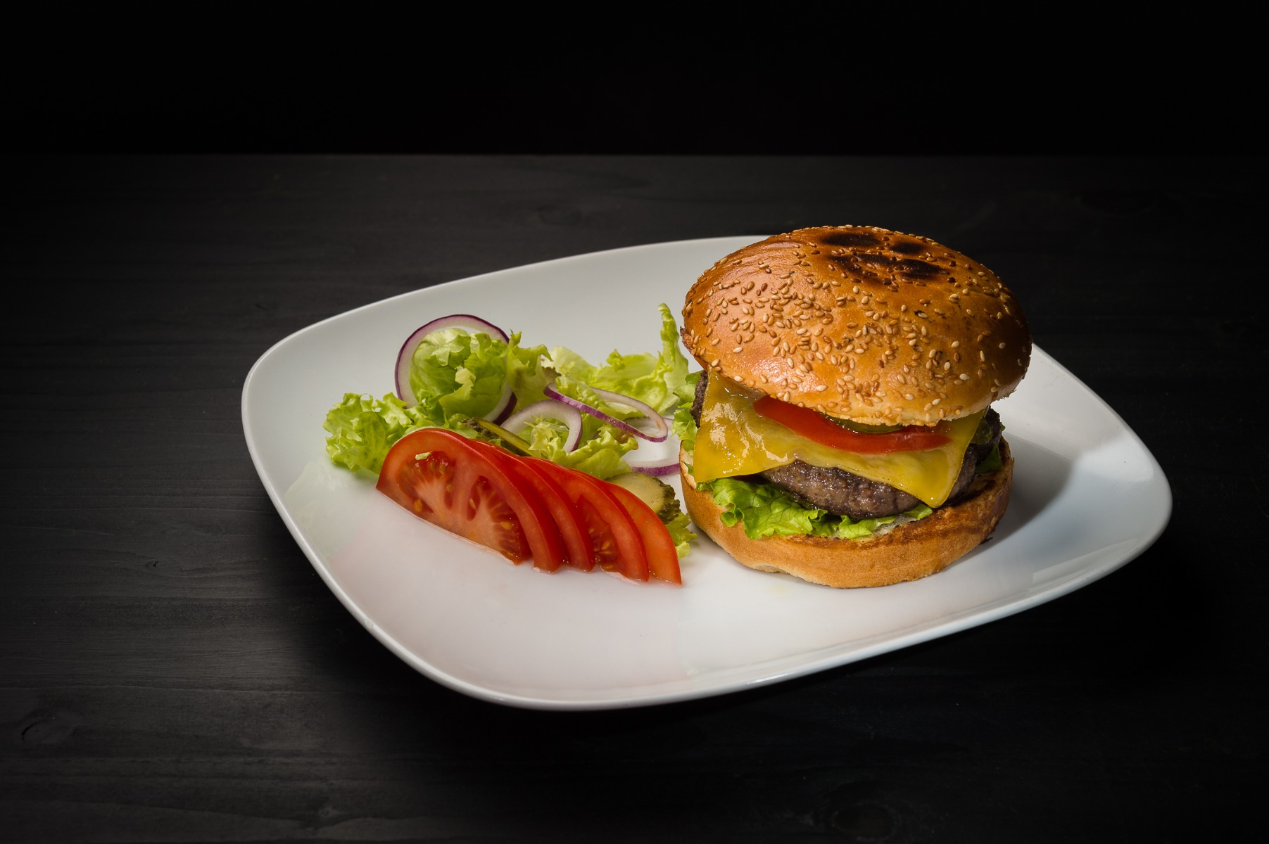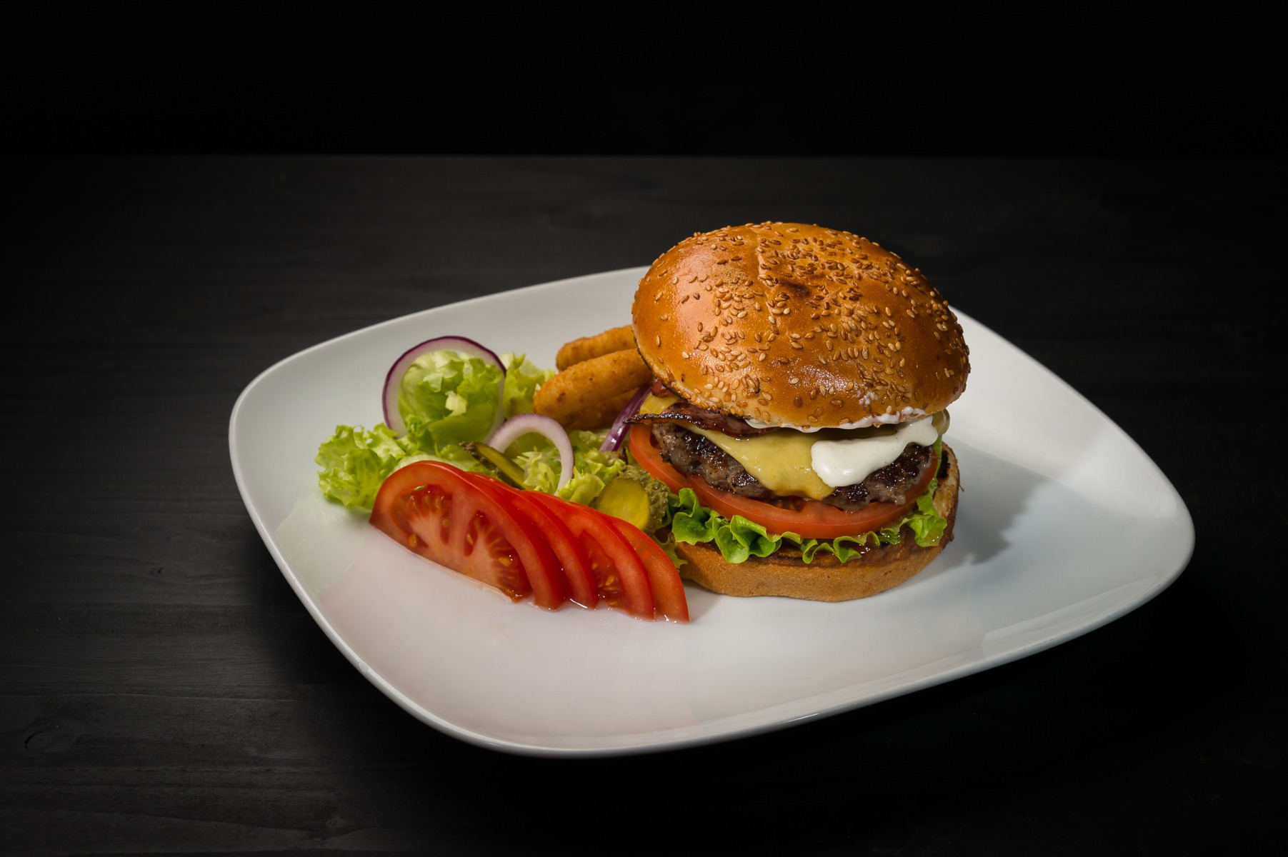 Snitel din piept de pui, salata, rosii, chifla, dressing, bacon, inele ceapa